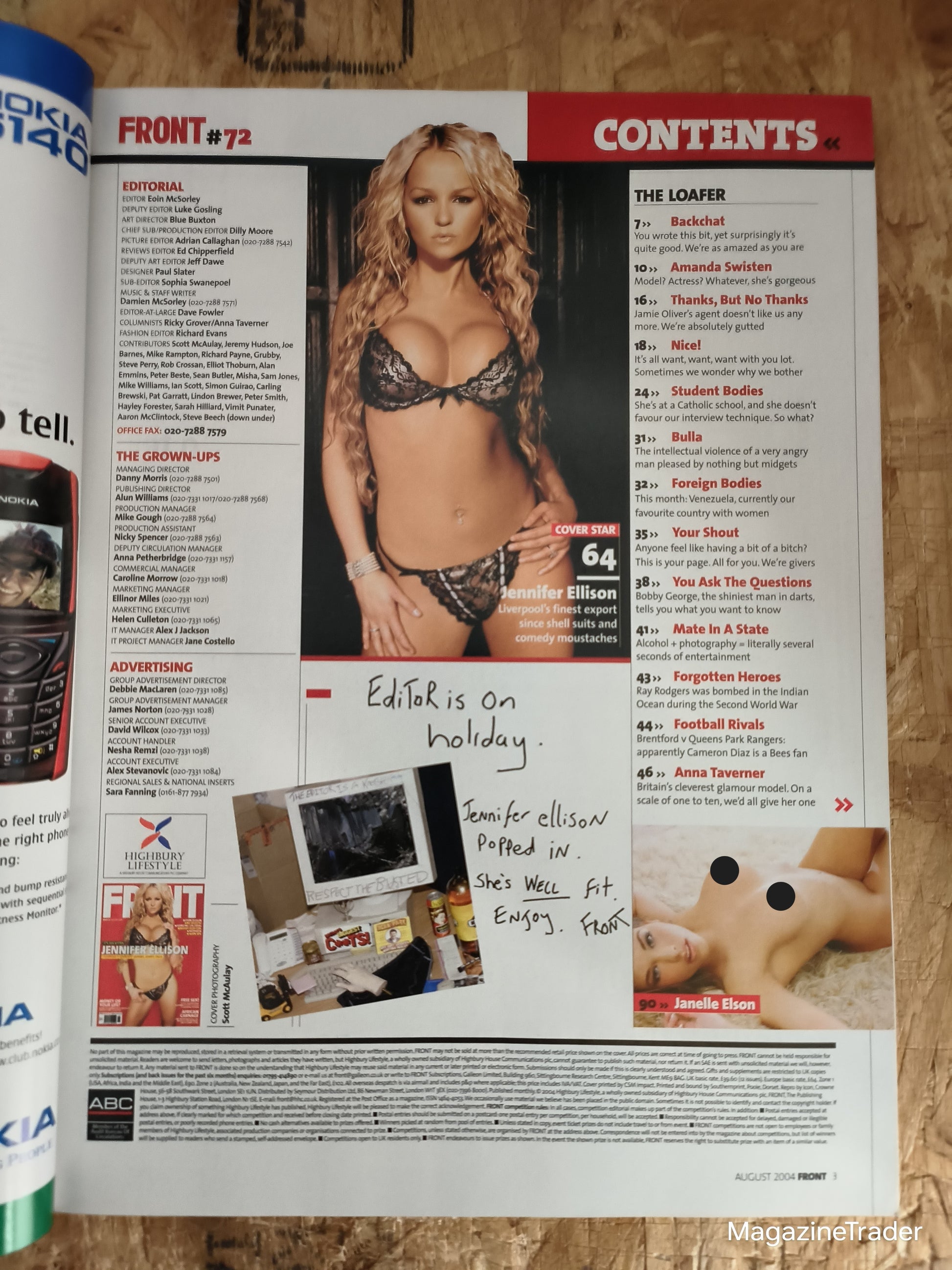 For sale is the original FRONT Magazine from August 2004. This classic issue from the alternative lifestyle era features the legendary Jennifer Ellison on the cover and inside in a major exclusive feature.