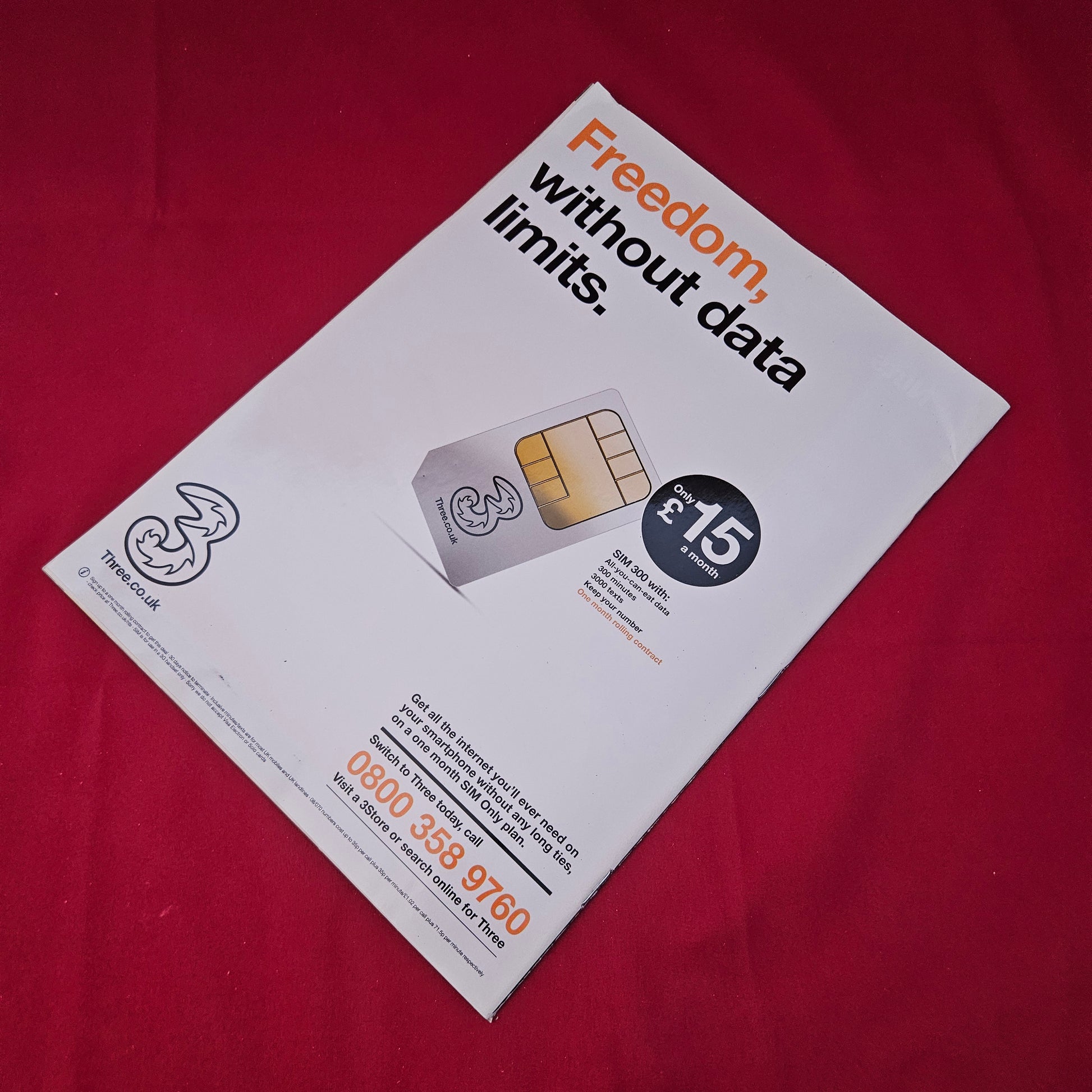 Rear Cover: Features a full-page promotional advertisement for the Three.co.uk "SIM 300" mobile data plan.