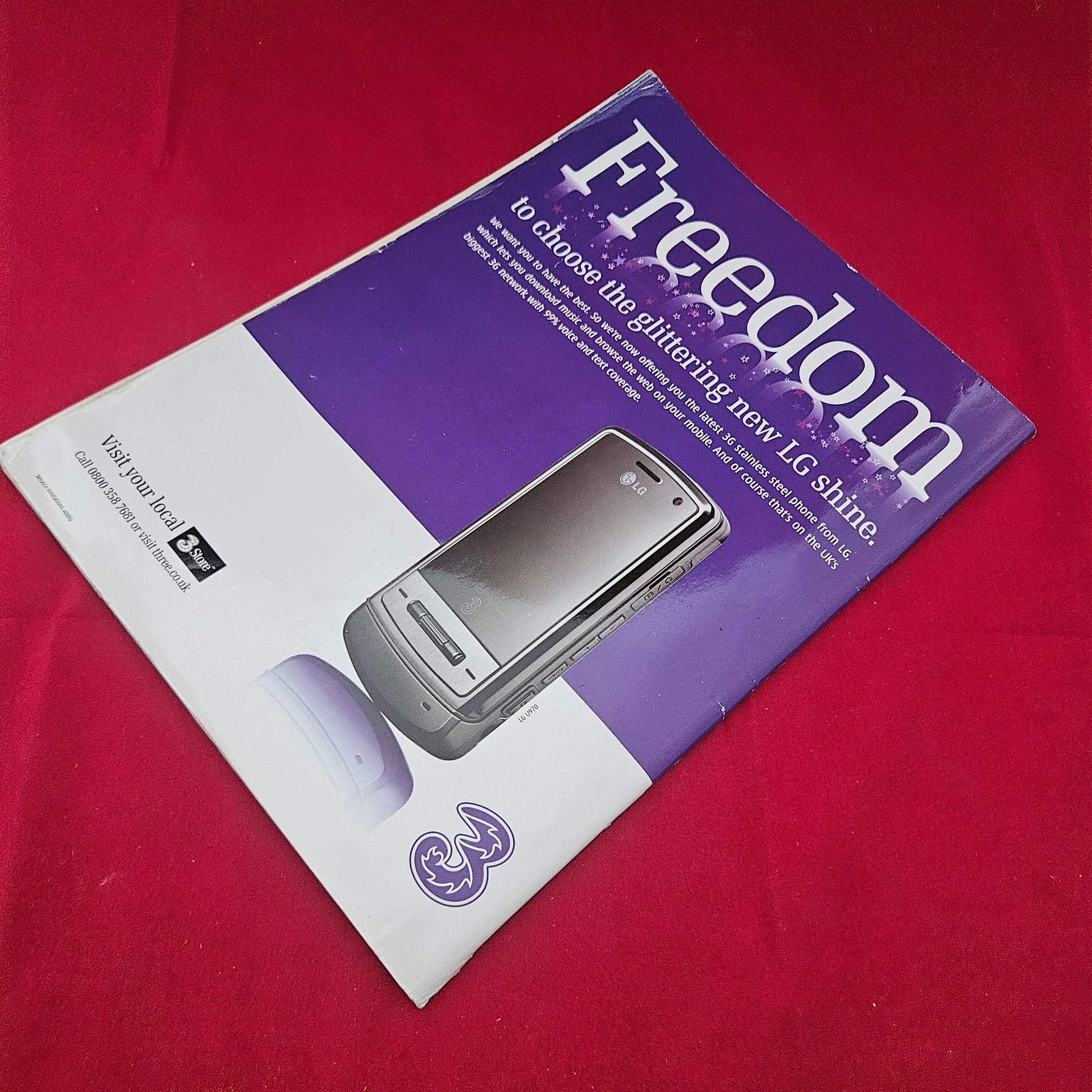 Rear Cover: Features a full-page color promotional advertisement for the LG Shine mobile phone on the 3 network.